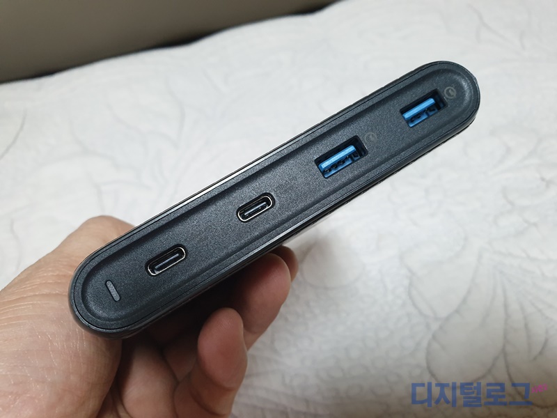 2개의 USB-A는 스마트폰에서 주로 쓰이는 퀄컴 3.0 고속 충전을 지원하고 2개의 USB-C는 애플 맥북 및 신형 태블릿의 고속충전을 제공하는 USB-PD를 지원한다는 것입니다. (USB-PD를 지원하는 2개의 C포트 충전용량이 60w 30W로 차이가 있다. 가운데 사진 맨 왼쪽이 60w를 지원하는 C포트이고 나머지 하나는 30W를 지원한다.)